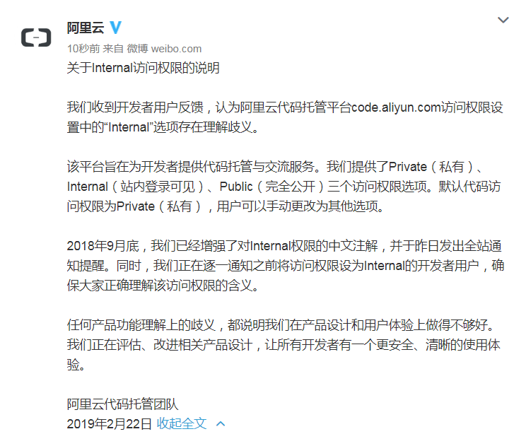 阿里云方面表示,2018 年 9 月底,阿里云曾增强对 Internal 权限的中文注解,并于近日发出全站通知提醒。同时,阿里云正在逐一通知之前将访问权限设为 Internal 的开发者用户,确保大家正确理解该访问权限的含义,并将继续评估、改进相关产品设计,让所有开发者有一个更安全、清晰的使用体验。
