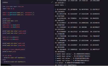 from scipy.stats import ttest_indimport numpy as npweek1 = np.genfromtxt("week1.csv", delimiter=",")week2 = np.genfromtxt("week2.csv", delimiter=",")print(week1)print("week2 data :-\n")print(week2)week1_mean = np.mean(week1)week2_mean = np.mean(week2)print("week1 mean value:",week1_mean)print("week2 mean value:",week2_mean)week1_std = np.std(week1)week2_std = np.std(week2)print("week1 std value:",week1_std)print("week2 std value:",week2_std)ttest,pval = ttest_ind(week1,week2)print("p-value",pval)if pval <0.05: print("we reject null hypothesis")else: print("we accept null hypothesis”)