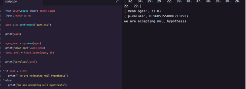 from scipy.stats import ttest_1sampimport numpy as npages = np.genfromtxt(“ages.csv”)print(ages)ages_mean = np.mean(ages)print(ages_mean)tset, pval = ttest_1samp(ages, 30)print(“p-values”,pval)if pval < 0.05: # alpha value is 0.05 or 5% print(" we are rejecting null hypothesis")else: print("we are accepting null hypothesis”)