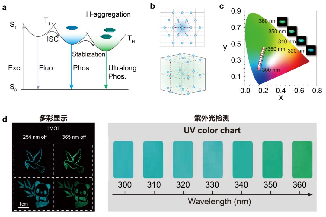 针对这一科学难题,黄维院士、安众福教授与新加坡国立大学刘小钢教授课题组合作,借鉴量子点、碳点等纳米材料实现多彩发光设计思想。在单一有机分子晶体中,通过巧妙的分子结构和晶体堆积设计,同时构筑分子态和聚集态的长余辉发光,获得了一系列激发波长依赖的动态多彩长余辉发光新材料。在晶体状态下,随着激发波长从250到400 nm的逐渐红移,有机长余辉发光颜色逐渐由紫色变为绿色,呈现出激发波长依赖的长余辉发光特性。该类材料的长余辉寿命为2.45秒,最大长余辉发光效率为31.2%。鉴于这种动态长余辉发光特性,该类材料被首次成功应用于多彩显示和可视化紫外光精准检测。