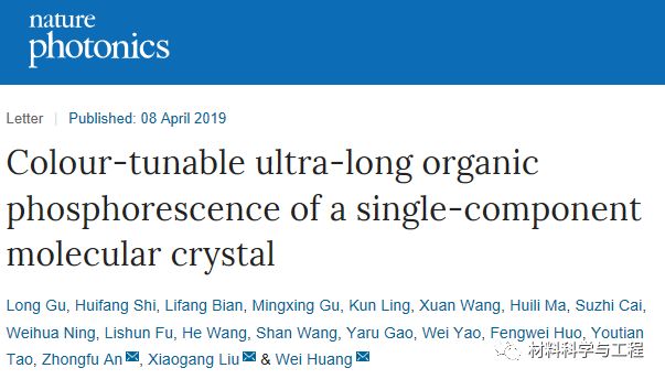近日,南京工业大学海外人才缓冲基地(先进材料研究院)黄维院士、安众福教授带领的团队在有机长余辉发光领域再次取得重大突破。他们首次实现了单一有机晶体材料下的多彩长余辉发光,展现了该类材料在多彩显示、防伪以及可视化紫外光精准探测等领域的应用潜力,相关成果于4月8日在线发表在国际顶尖学术刊物——Nature Photonics(《自然·光子学》)上。文章第一作者为谷龙博士与史慧芳副教授。该工作也是黄维院士团队近两周内在Nature Photonics(《自然·光子学》)上连续发表的第二篇工作。