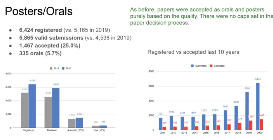 在6424篇论文中,最终接收了 1467 篇,如果只考虑有效投稿数量,那么接收率约为 25%,这比例和2019年打平。另外,在这1467篇论文中,Oral论文有335篇,比例为5.7%。刘策表示和往届CVPR一样,论文被选为口头报告和海报,纯粹是基于质量,在是否接收的决策过程中没有设置上限。