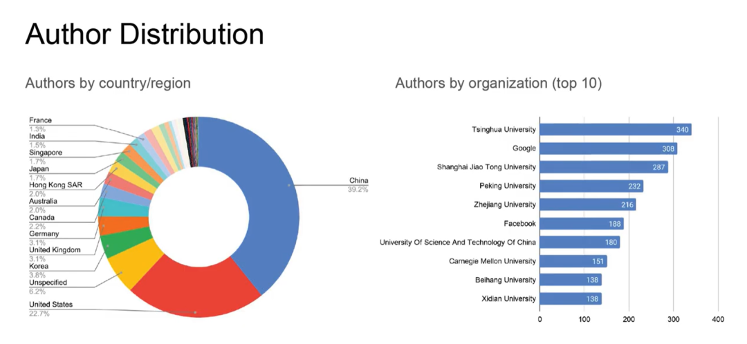从机构角度来看,清华大学的340篇数量超过了谷歌的308篇数量,上海交通大学、北京大学、浙江大学分别名列前五。