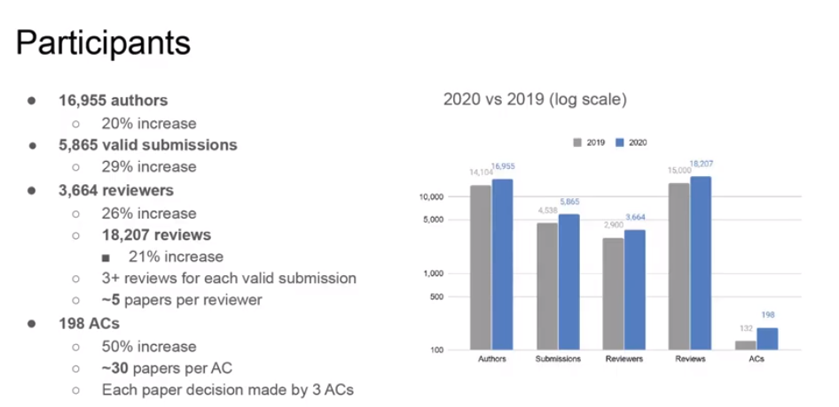 领域主席数量也有增加,CVPR 2020的领域主席有198位,这一数字比2019年增加了50%。刘策表示,为了提高CVPR的稿件质量,平均每篇文章的录用至少有三位领域主席做决定,平均每位领域主席审稿30篇左右。