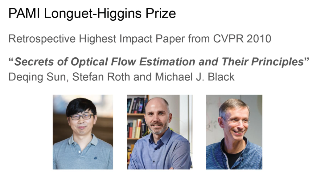 获得PAMI Longuet-Higgins 奖项的是发表在CVPR 2020 上的《Secrets of Optical Flow Estimation and Their Principles》,作者有三位分别是Deqing Sun、Stefan Roth以及Michael J.Black。