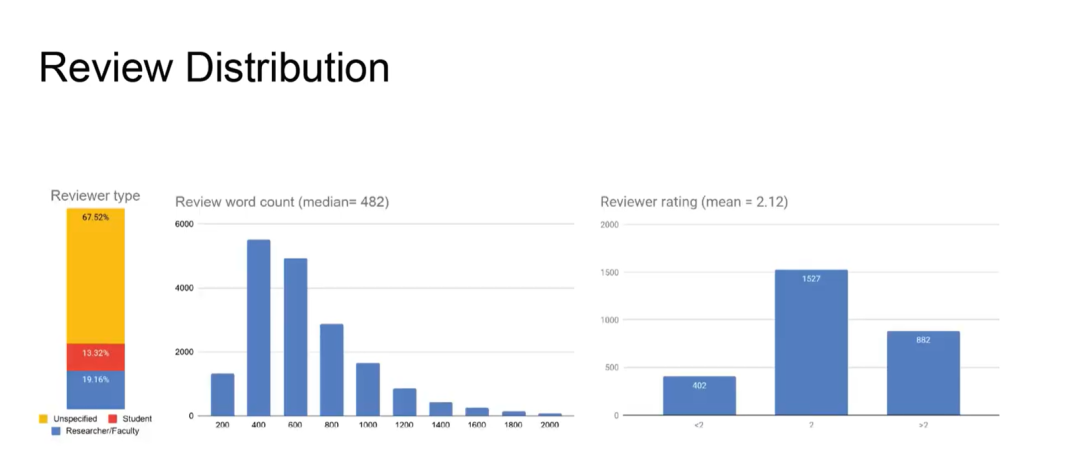 审稿的情况,也进行了可视化展示,评审意见的平均字数为482,平均打分为2.12。