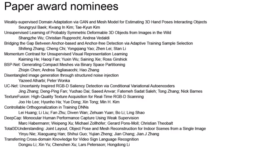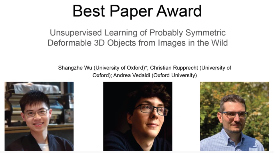 最佳论文是由牛津大学的三位研究员的《Unsupervised Learning of Probably Symmetric Deformable 3D Objects from Images in the Wild》论文获得,其提出了一种无需外部监督即可从原始单视图图像中学习3D变形对象的方法。