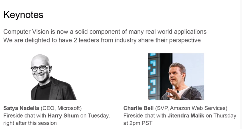 紧接着Gerard Medioni再次回顾了举办线上CVPR所遇到的挑战,以及一系列的赞助者,并重点提了两个工业界的嘉宾Keynote。分别是微软CEO Staya Nadella(炉边对话,主持人沈向洋)和AMAzon AWS的SVP Charlie Bell(炉边谈话,主持人Jitendra Mailk)都是非常棒的看点。