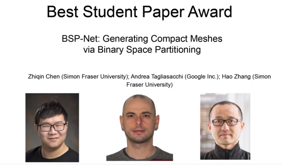 获得最佳学生论文的是《BSP-Net:Generating Compact Meshes via Binary Space Partitioning》,中文翻译过来是《BSP-Net:通过二叉空间分割生成紧凑网络》,这篇论文从多边形网格入手,基于计算机图形学的经典空间数据结构Binary Space Partitioning(BSP)来设计了一个BSP-Net。