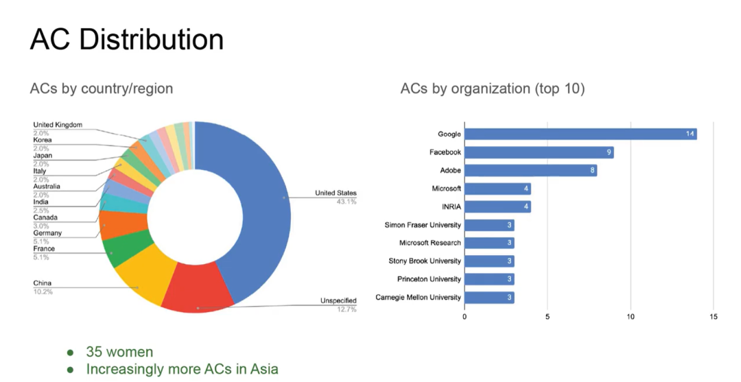 领域主席的分布,刘策特别点出了本届领域主席有35位女士,亚洲领域主席的数量在不断上升。从比例来看,美国仍然是大头,占比43.1%,中国排名在Unspecified之后为第三。从机构来看,谷歌14位的数量稳居老大,Facebook、Adobe、微软都在前五之列。