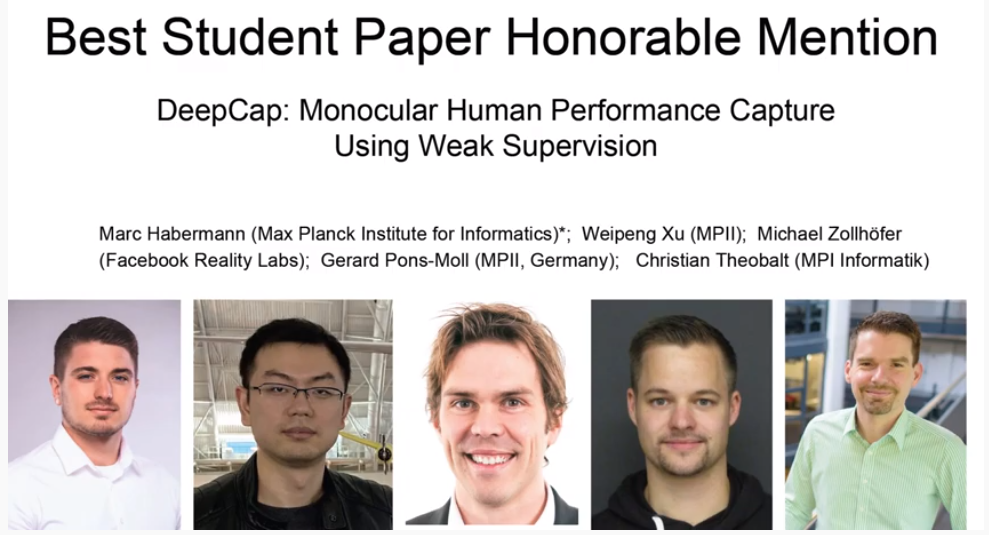 最佳学生论文荣誉提名的是《Deep Cap:Monocular Human Performance Capture Using Weak Supervision》论文作者有五位之多,其中有一位是华人面孔。