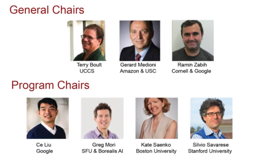 在正会一开始,大会主席Gerard Medioni致了欢迎词之后,就介绍到今年的大会组委会,他说组委会有3位大会主席,四位程序主席,还有很多科技主席、workshop主席等等为线上的CVPR做了许多的贡献。在决定将会议搬到线上之前,组委会成员有过很多讨论,也做出了非常重要的决定。多亏了Terry Boult的最后努力,才确保CVPR20决定线上会议。