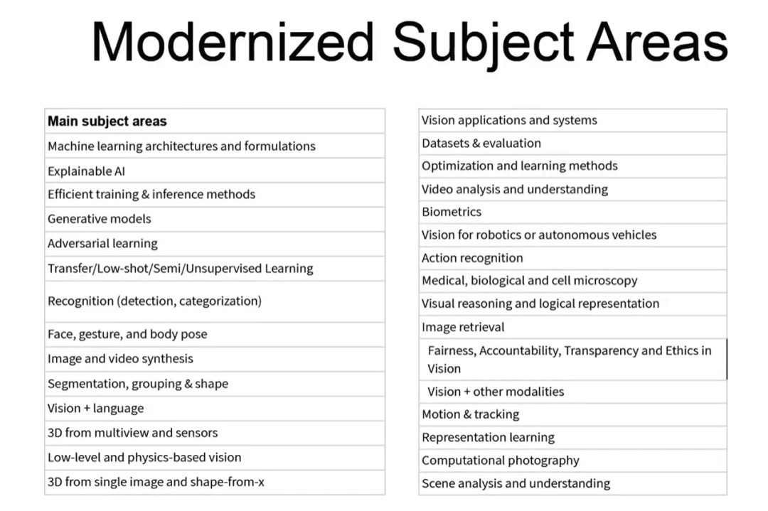 介绍完了这些之后,斯坦福大学的SiMo Savarese,也是本届的程序主席,他介绍了现代的研究领域,共有30多个,包括了机器学习架构和可扩展AI等。