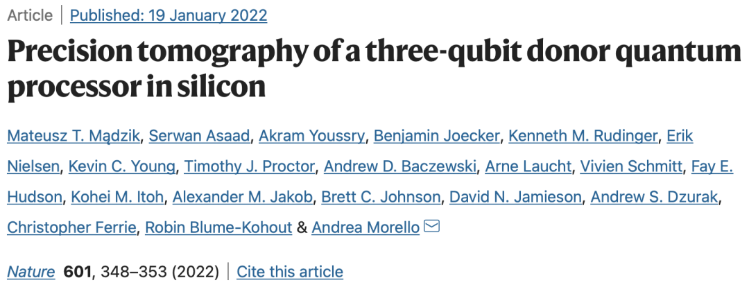 「Precision tomography of a three-qubit donor quantum processor in silicon」,一作Mateusz T. Mądzik,同样来自代尔夫特理工大学。共同一作Serwan Asaad,来自哥本哈根大学尼尔斯·玻尔研究所。