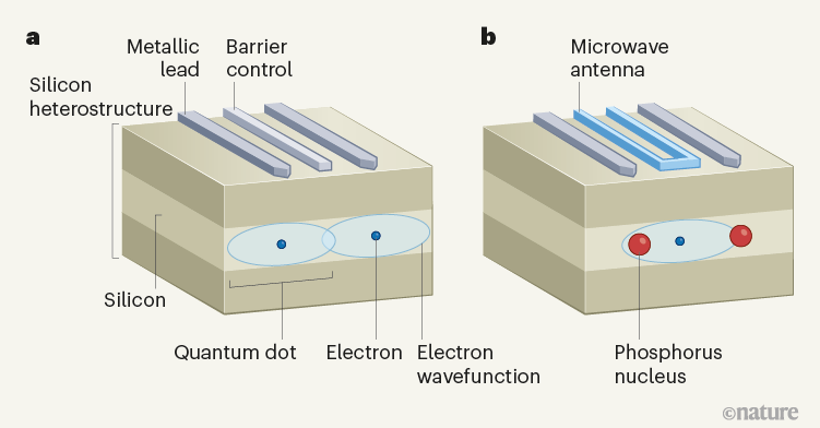 两个研究团队通过定位两个电子,使它们的量子力学波函数(电子的空间范围)重叠到一定程度,由作为量子点之间的屏障的电场来控制,从而实现双量子比特门。