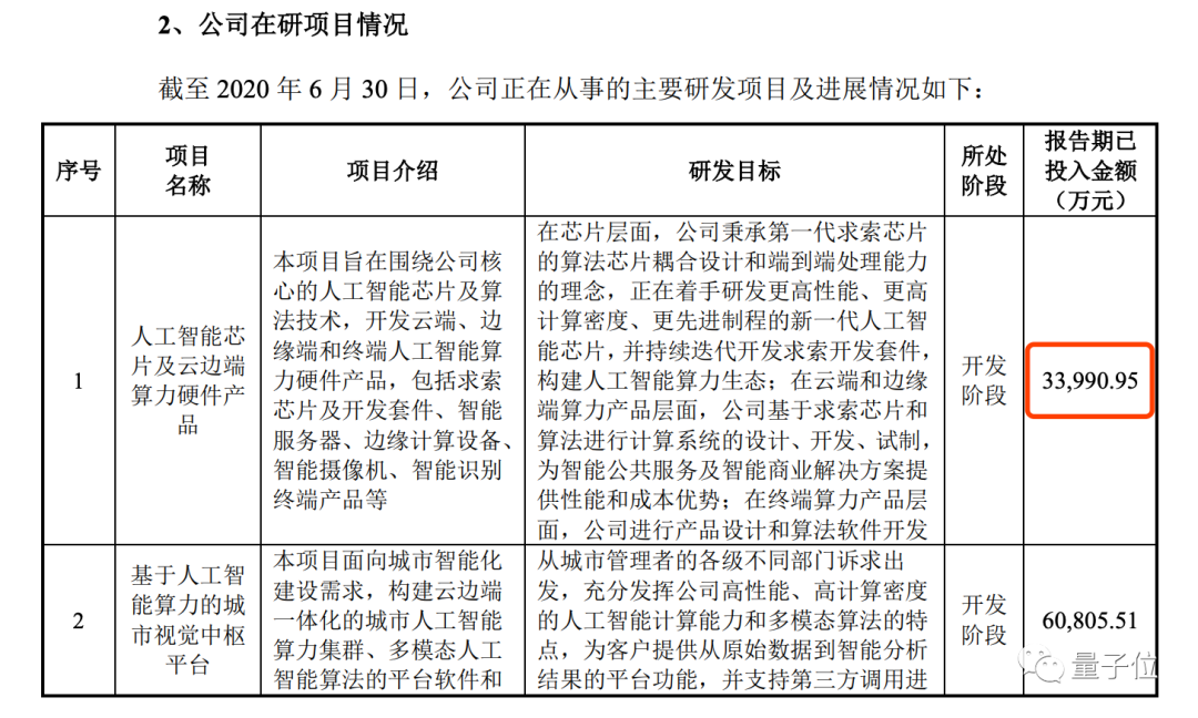 在招股书中,依图披露了主要研发投入项目,其中AI芯片为核心的首要项目,报告期内已经累计投入了3.3亿元。