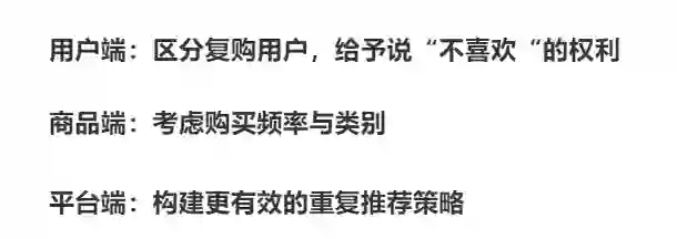 在这个用户看来已买不会再买的东西(如耳饰),在另一个用户眼里可能是会重复购买。也许可以加入一些用户行为去进行考虑(如这个人是否经常购物、经常买什么类别的产品),但因为人是动态变化的,推荐机制难以完美区分什么商品在用户眼里是重复,什么商品在用户眼里是高频购买类。