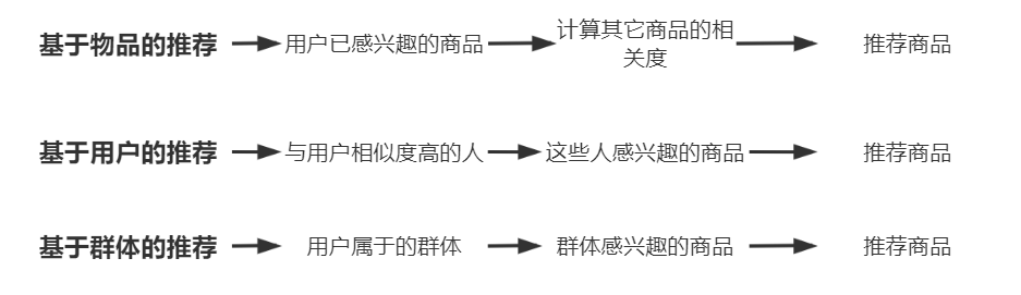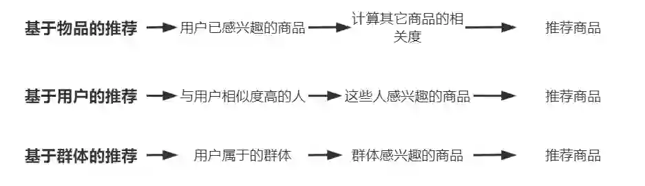 首先先给大家介绍一下目前主流的电商推荐策略,主要分为基于物品的推荐体系、基于用户的推荐体系、基于群体的推荐体系。