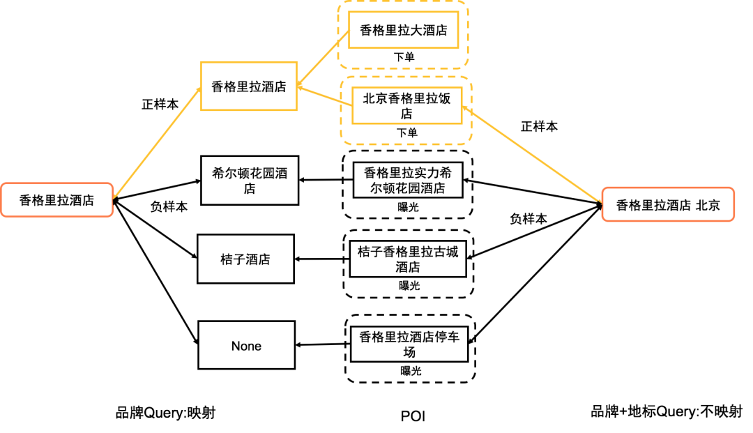 负样本过滤:如果搜索词是品牌词,在选取负样本的时候只在其他品牌的样本中选取。如POI为“香格里拉实力希尔顿花园酒店”、“桔子香格里拉古城酒店”时,同Query “香格里拉酒店”虽然字面很相似,但其明显不是用户想要的品牌。