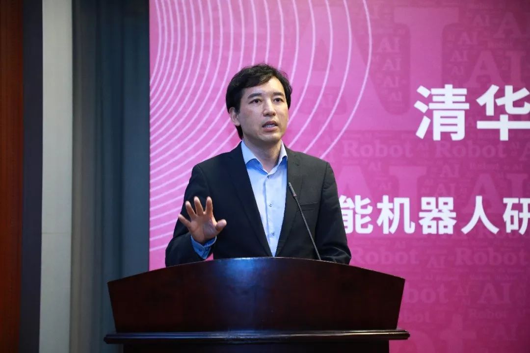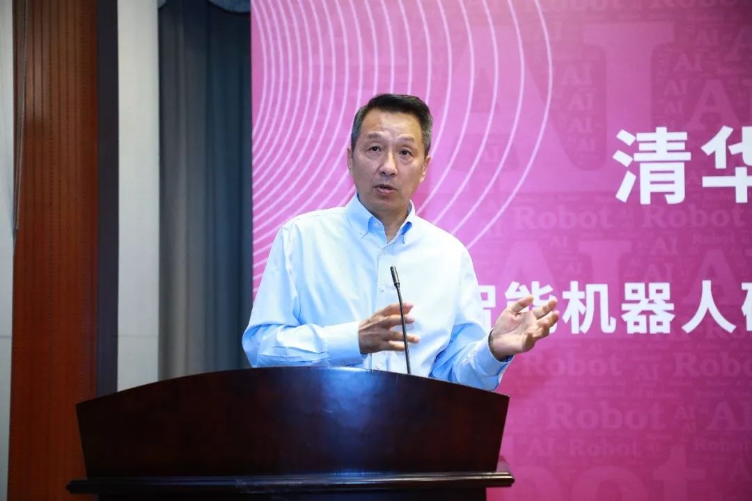 张钹院士代表清华大学人工智能研究院致辞。张钹院士指出清华大学作为最早开展机器人研究的高校,已然成为了智能机器人研究的摇篮,拥有浓厚的历史积淀。人工智能本身的研究离不开三个内容:感知、决策与行动,而智能机器人恰恰是行动这一重要环节的载体,它除了本身的行动控制外,还要结合感知与理性思考决策。智能机器人研究将是不可替代的交叉学科人工智能研究领域,希望中⼼能够团结全世界的研究人员,将创新落实到应用,带领清华大学继续走向世界一流。