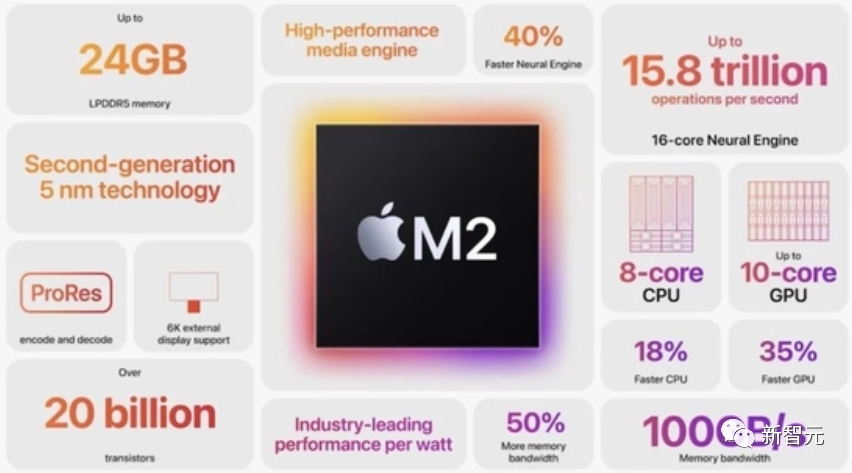 Apple的M2还具有新一代的「安全飞地」和神经引擎,以及支持8K H.264和HEVC视频的新一代媒体处理引擎。