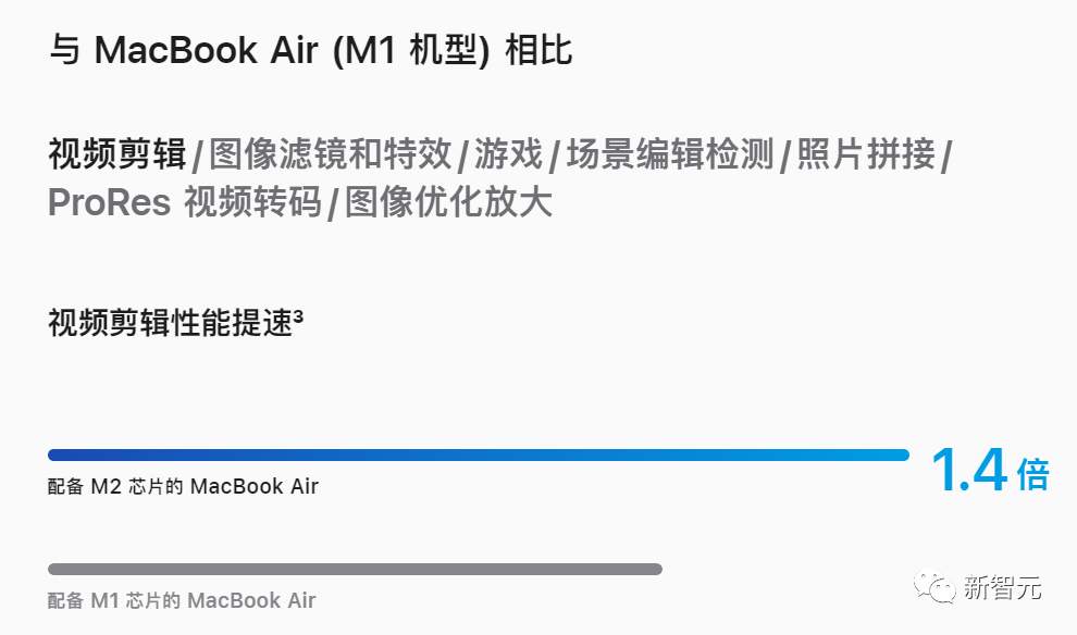 搭载M2芯片的MacBook Air,在视频和图像类任务上(如视频剪辑、视频转码、照片拼接等)的性能达到了M1芯片的1.4倍。