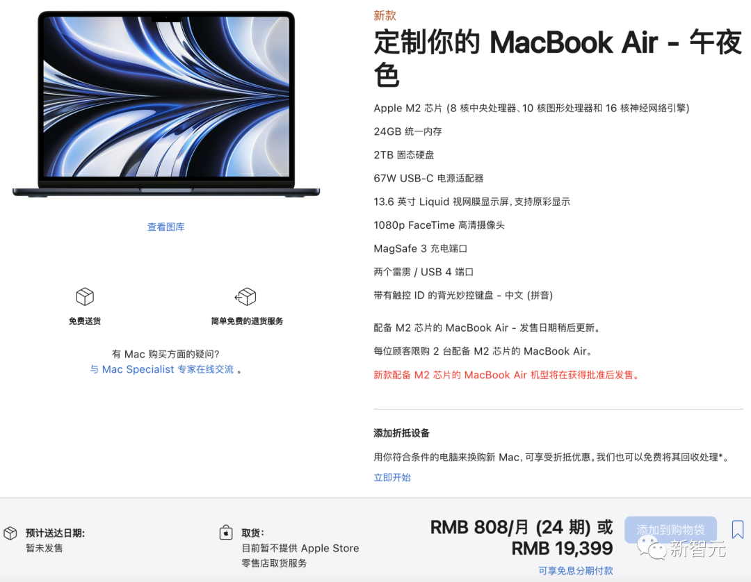 新版MacBook Air搭配了四种颜色:太空灰、星光、午夜和银色。价格为1199美元(7996元人民币)起售。