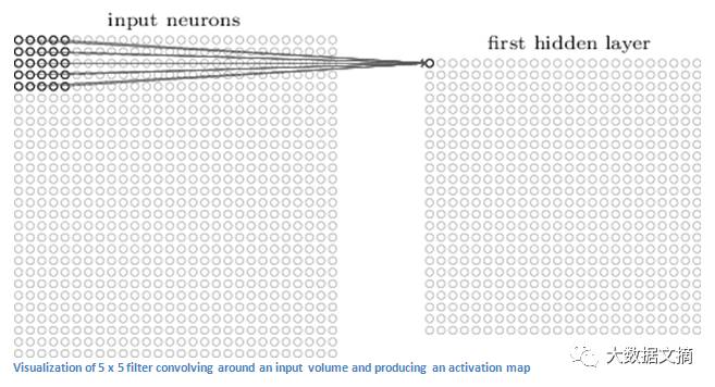 CNN的第一层通常是卷积层。首先,你需要记住卷基层的输入是什么。如上所述,输入是一个32 x 32 x 3的像素值数组。现在,解释卷积层的最好的方法就是想象一个手电筒正从图像的左上角照过。我们假设这个手电筒的光覆盖了一个5 x 5的区域。然后,我们想象这个手电筒的光照过输入图像的所有区域。在机器学习的术语中,这个手电筒叫做过滤器(有时也被称作神经元或者内核),手电筒照过的区域称作感受域。现在这个过滤器也是一个数组(其中的数字被称为权重或者参数)。一个非常重要的注意事项是过滤器的深度要和输入的深度相同(这保证可以进行数学运算),所以这个过滤器的大小是5 x 5 x 3。现在我们以滤器的第一个位置为例,即图像左上角。随着过滤器在输入图像上滑动,或者进行卷积运算,过滤器中的值会和图像上的原始值相乘(又称作计算点积)。将这些乘积相加(从数学角度讲,一共会有75个乘积),你就得到了一个数字。记住,这个数字只是过滤器在图像左上角时得到的结果。现在,我们在输入内容的每一个位置重复这一过程。(下一步是把过滤器向右移动一个单位,然后再右移一个单位,以此类推)。输入内容上的每一个特有位置都会产生一个值。过滤器滑过所有位置后,你会发现你得到了一个28 x 28 x 1的数组,我们把它称作激活映射或特征映射。你得到一个28 x 28数组的原因是,5 x 5的过滤器在32 x 32的输入图像上有784个不同的位置。这784个数字映射成了一个28 x 28的数组。