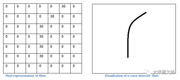让我们从更高层次来看卷积实际在做什么吧。每一个过滤器都可以看做为一个特征标识器。这里的特征是指直线、简单的颜色以及曲线之类的东西,这些都是图片所共有的最简单特征。我们的第一个过滤器是一个7 x 7 x 3的曲线检测器。(为了简化这个问题,在这里我们先忽略过滤器有3个单位深度这一事实,只考虑过滤器和图片的最上层切片。)曲线检测器有一定的像素结构,在该结构中,沿着曲线形状的区域将具有更高的数值。