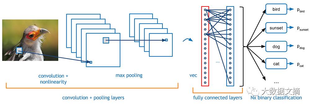 回到细节上来,CNN所需做的是,拿到图像,输入一系列卷积、非线性、池化(下采样)和完全连接的层中,最终得到一个输出。就像我们之前说的,输出可以是能最好描述图的分类的一个单一结果或者一组分类的概率。现在,最难的部分即是理解每一层的工作原理。首先让我们来看看最重要的部分。