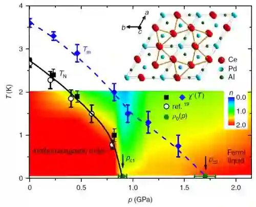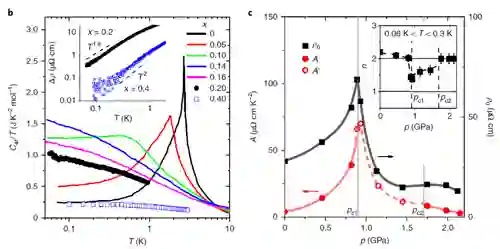 图1:CePdAl中压力诱导量子临界相的产生。(a) 温度-压力相图和电阻率的温度指数。(b) 通过掺杂产生的化学压力表现出和静水压同样的结果,在量子临界相中具有发散的电子比热系数。(c) 电阻率的A系数和残留电阻对应两个临界压力,中间区域代表量子临界相。
