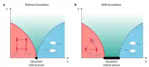 图2:非自旋阻挫体系中的量子临界点和自旋阻挫体系中的量子临界相的对比。