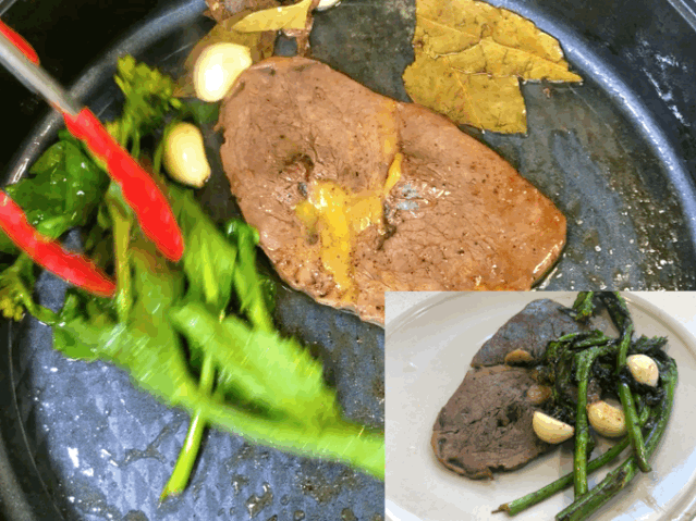 最后把牛排盛到一个被加热过的盘子,或者用盖子扣上,牛排需要静置2分钟,名为:醒肉。这2分钟是为了锁住牛排里面的汁水。