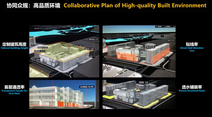 第四是开放众规。我们希望能够汇聚到世界上各种智慧,参与到规划建设过程中,另一方面是希望推动市民和政府之间有效的沟通渠道,能够推导城市的整个治理方面的改善。在公共参与的过程中,我们还是的是高品质发展,我们希望通过三维的方式,非常直观地告诉非专业人员哪些方面需要进行彼此的互动,比如说定制建筑的高度、首层的通透率、城市是否贴线走,形成良好街道,甚至是透水铺装率,哪些地方雨水可以渗透到地面,补给地下水源,通过一些直观的方式促进和老百姓的交流。