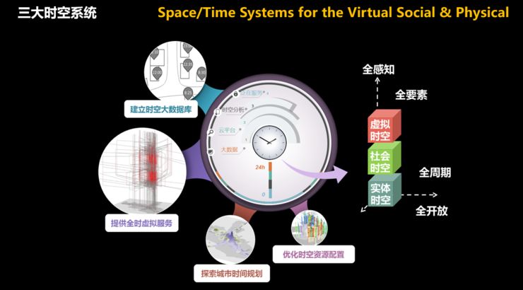 最后总结。我们这个平台希望形成一个全感知、全要素、全周期、全开放的体系,包括孪生城市,一个是实体城市,也就是实体的时空,另一个是虚拟城市、虚拟时空,但核心是把这两方面有效结合起来,促进社会的时空。