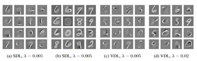实验结果可以看到,对于两个SDL和两个VDL的字典元素(dictionary elements)来说,在稀疏度λ较低的情况下(0.001, 0.005)解码器似乎可以学到方向、笔划,甚至是是数字图形中的一部分。