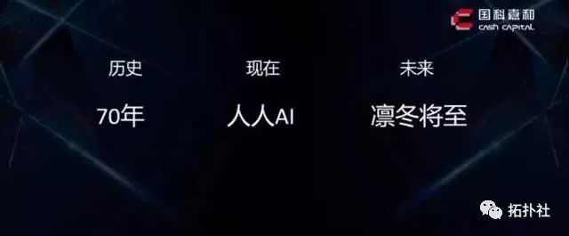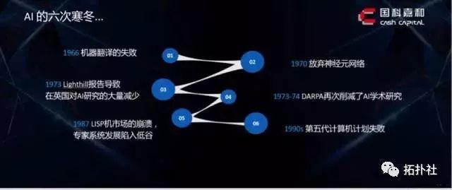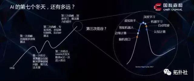 人工智在过去的60年70年经历了几个大波的寒流,一波一波起来,然后再一波一波下去,此图基本上是我们看到的整个的人工智能的情况。所以这块我也不展开了,大家有兴趣可以到网上查一查就很清楚。