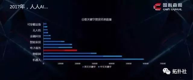 现在人人谈AI。讲个今年的实际现象,我们一年要看大概2400个项目,然后有一个总结,一小时谈话分三个阶段,第一个阶段说干了什么事;差不多第二个阶段到了,谈大数据;最后一个阶段一定谈人工智能。现在如果不谈人工智能,在这个圈里都不好意思来融资。图中AI这个搜索统计也可以作为一个佐证。