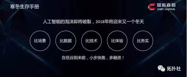 如果你现在还在做人工智能创业,我建议是赶紧小步快跑,先拿一部分钱放手里是最佳选项。等到2018年6月份以后没人看了,这个时候比谁有棉袄、谁有粮草、谁能存活下来。