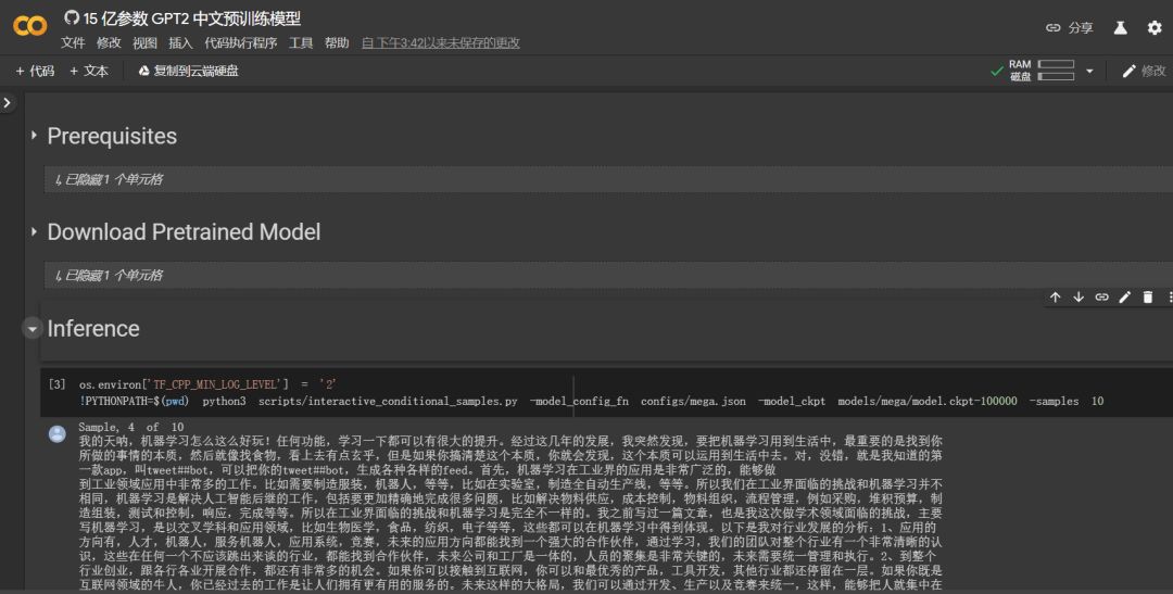 Colab 演示地址:https://colab.research.google.com/github/imcaspar/gpt2-ml/blob/master/pretrained_model_demo.ipynb