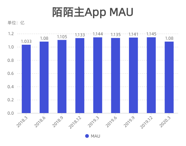 财报显示:2018年3月,陌陌月活跃用户数量(MAU)首次突破1亿。其后,陌陌的月活用户数均在1.1亿左右徘徊,2020年3月更是创下近18个月内新低,重回2018年6月。