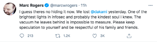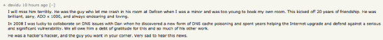 「我将非常想念他。他是那个在Defcon大会上让我在他的房间里睡觉的人,当时我还是个未成年人,太小了,不能自己订房间。这拉开了20年友谊的序幕。他才华横溢,爱说爱笑,注意力不集中,而且总是令人喜爱,充满爱心。