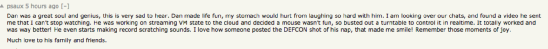 「丹是一个伟大的灵魂和天才,听到这个消息,我很难过。丹让生活充满乐趣,我正在翻看我们的聊天记录,发现了他发给我的一段视频,我忍不住要看。他正在研究将虚拟机的状态流传到云端,并认为鼠标不好玩,所以拿出一个转盘来实时控制它。它完全起作用了,而且好得多!他甚至开始发出刮唱片的声音。他甚至开始发出刮唱片的声音。我喜欢有人贴出他午睡时的DEFCON照片,这让我笑了起来!我觉得这是很好的。记住那些快乐的时刻。