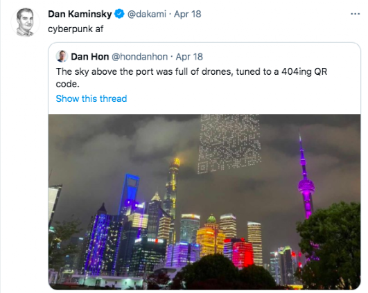 而卡明斯基的推特也停留在了4月18日,其中包括一条为上海东方明珠上空的二维码而惊奇的推文。