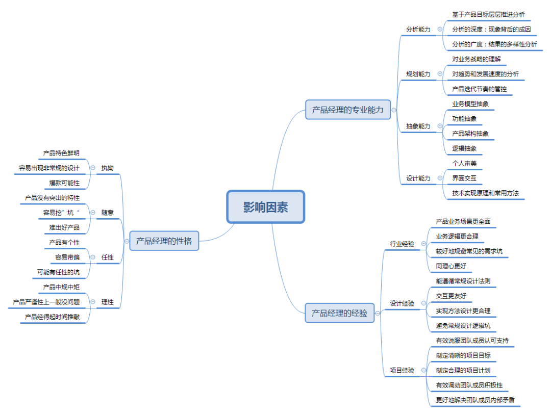 其次用xmind分析下产品的度受产品经理的性格、专业能力、行业经验的影响: