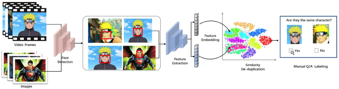 利用卡通人脸检测、特征提取器、特征聚类等进行噪声数据过滤,其中特征提取器随着标注数据的增多而性能不断增强。