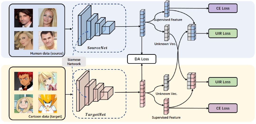 我们提出了卡通和真人多人物训练框架如下图4所示,主要分为分类损失函数、未知身份拒绝损失函数和域迁移损失函数。