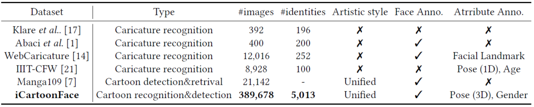 然而,对卡通人物身份的识别,却鲜有研究,相关的数据集也比较少,如下表1。对于深度学习来说,这些已有的卡通识别数据集存在着数据量较小、噪声比例较大的问题。因此构建一个大规模、高质量的卡通识别数据集,并对卡通人物身份信息进行识别,则至关重要。