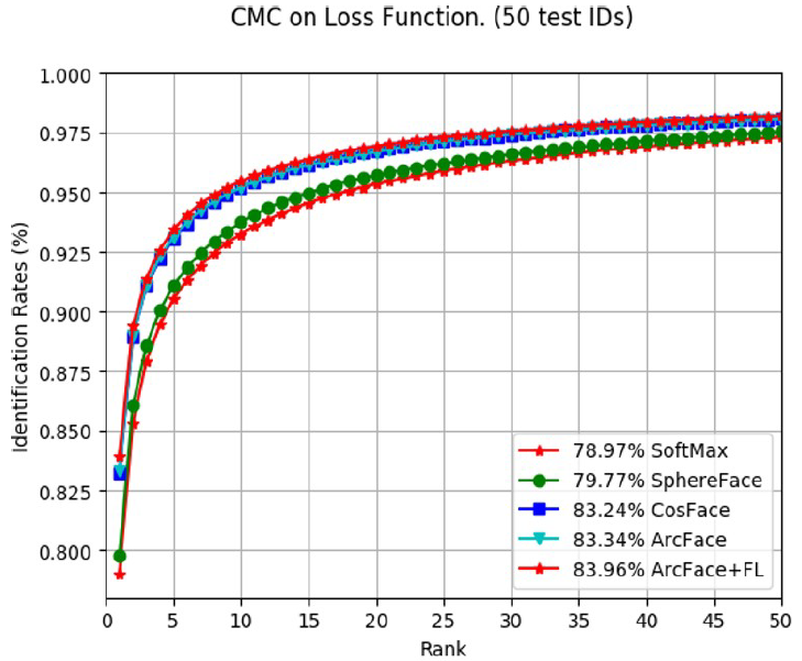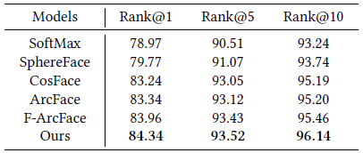 我们比较了SoftMax、SphereFace、CosFace、ArcFace、ArcFace+FL几种算法的性能如下图5所示。结果表明,