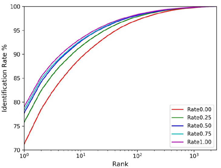 我们测试了算法在卡通人脸基础上扩充不同比例下的性能如图7所示,图中表示了在包含更多的上下文信息下会获得更高的识别性能。